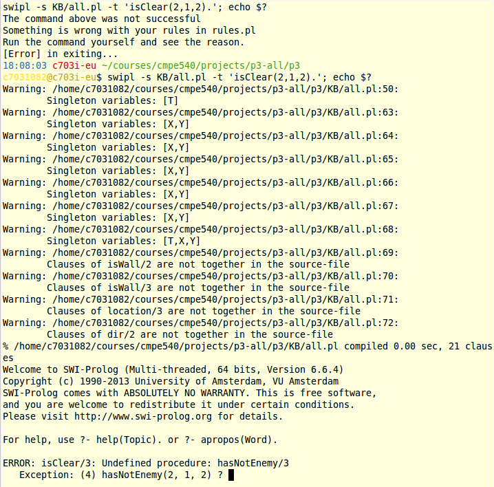 swipl -s KB/all.pl -t 'isClear(2,1,2).'; echo $?