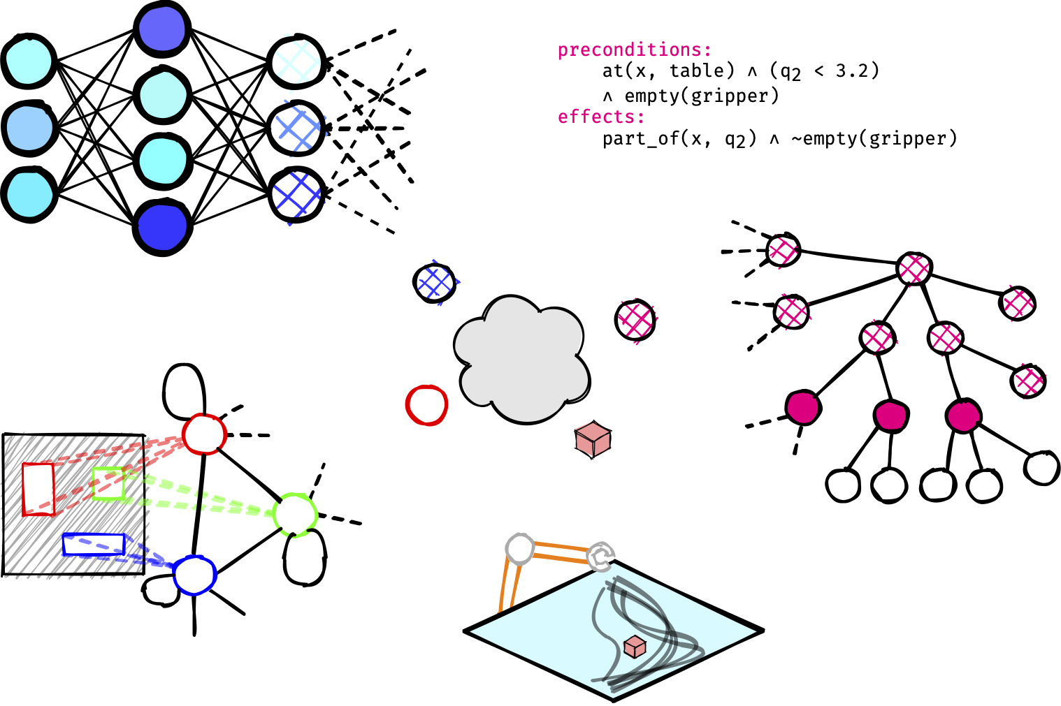 In this project, we realize mechanisms for the robots that enable them to discover both high-level low-dimensional discrete object and action primitives and their associated operators, and to learn low-level high-dimensional continuous predictive models that are used in both high and low-level planning and verification. To the best of our knowledge, simultaneous discovery of object, effect, and action categories, learning their associated operators, and using these operators for planning has not been studied in the literature yet. Different deep neural network architectures are proposed for the discovery of action primitives. Firstly, we suggest passing the sensorimotor trajectory into a conditional neural process network, taking the sensorimotor trajectory as input and extracting the discrete category of the motor component through a discrete bottleneck layer. Alternatively, using the same network structure, we propose to create both continuous and discrete latent representations, and suggest using discrete representation to filter continuous data, thus allowing categories to emerge in the discrete representation. Finally, we propose a structure that obtains both object and action categories using Attention architecture and discrete activation layers.