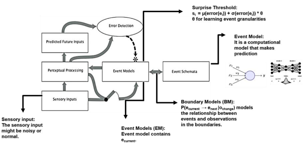 Event is a fuzzy term that refers to a closed spatio-temporal unit. The aim of the project is to develop a computational model that can learn event models and use learned event models to segment ongoing activities in varying granularities and compare its performance with human subjects. By doing so, we aim to clarify the effect of the reliability of sensory information and expectation on event segmentation performance by several experiments through our computational model and to develop a computational model that is capable of learning, segmenting and representing new events while being robust to noise. In addition to comparing human event segmentation performance with that of the computational model, we plan to design a new validation method to increase the reliability of assumptions of the computational model in terms of validating the psychological theory and assessing how well the computational model performs in terms of capturing human event representations. Results of our experiments and our computational model will be used to validate predictions of a psychological theory, namely Event Segmentation Theory, and to develop robotics models that are capable of simulating higher-level cognitive processes such as action segmentation in different granularities and formation of concepts representing events.